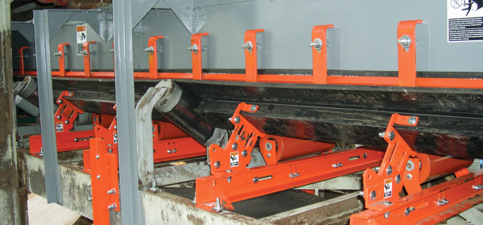 Training idlers are used to adjust the tracking of the conveyor belt. Misalignment can cause significant damage to the belt and the system. Training idlers pivot and tilt to guide the belt back to the center of the conveyor.
