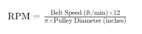 The formula for calculating the RPM of a conveyor belt is: